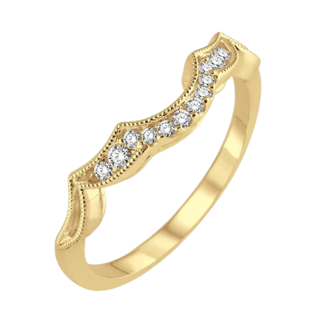 Treasure her with the timeless allure of this ravishing milgrain finish diamond wedding band. Fashioned in luminous 14 karat yellow gold this open work curved design wedding band is studded with 12 scintillating round cut diamonds, perfectly pave set. Total diamond weight is 1/10 ctw.