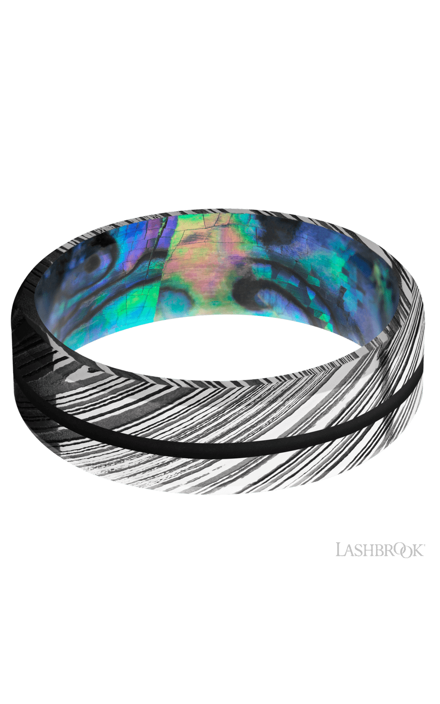 7 mm wide/Beveled/Woodgrain band with one 1 mm Centered inlay of Black also featuring a Abalone sleeve.