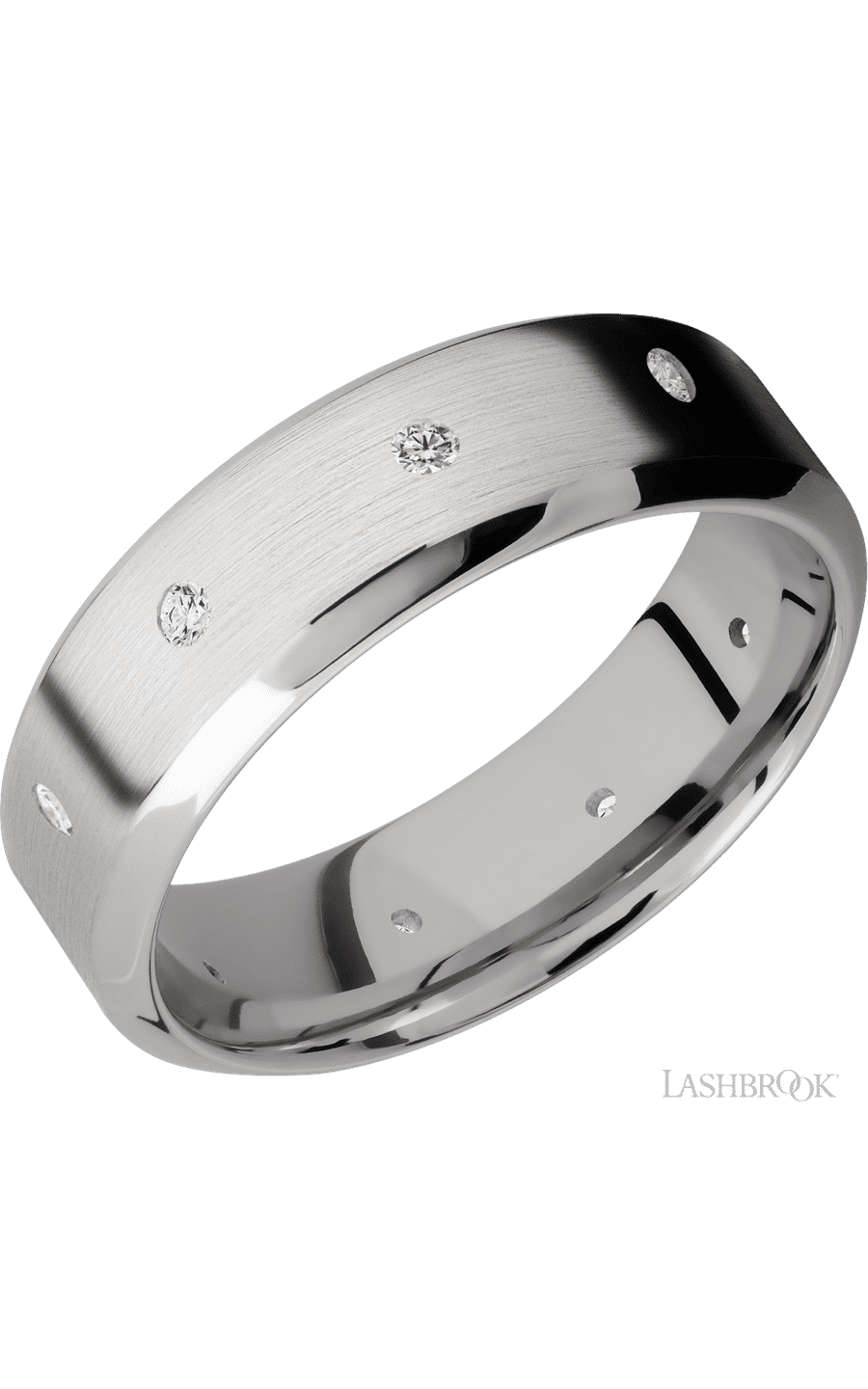 7 mm wide/High Bevel/14K White Gold band with a 9X Even arrangement of .03 carat Round Diamond stones in a Flush setting.
