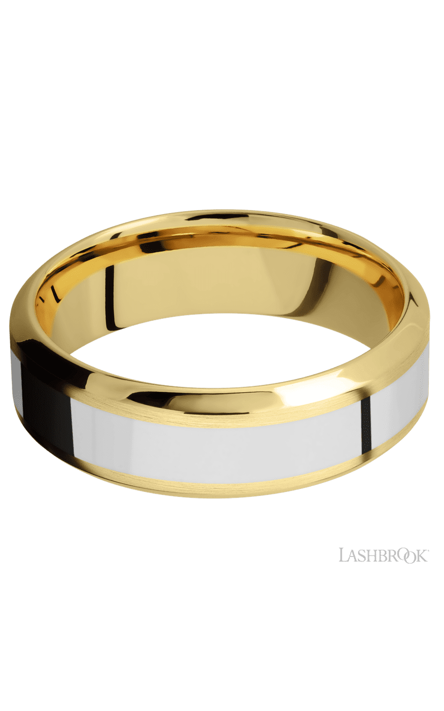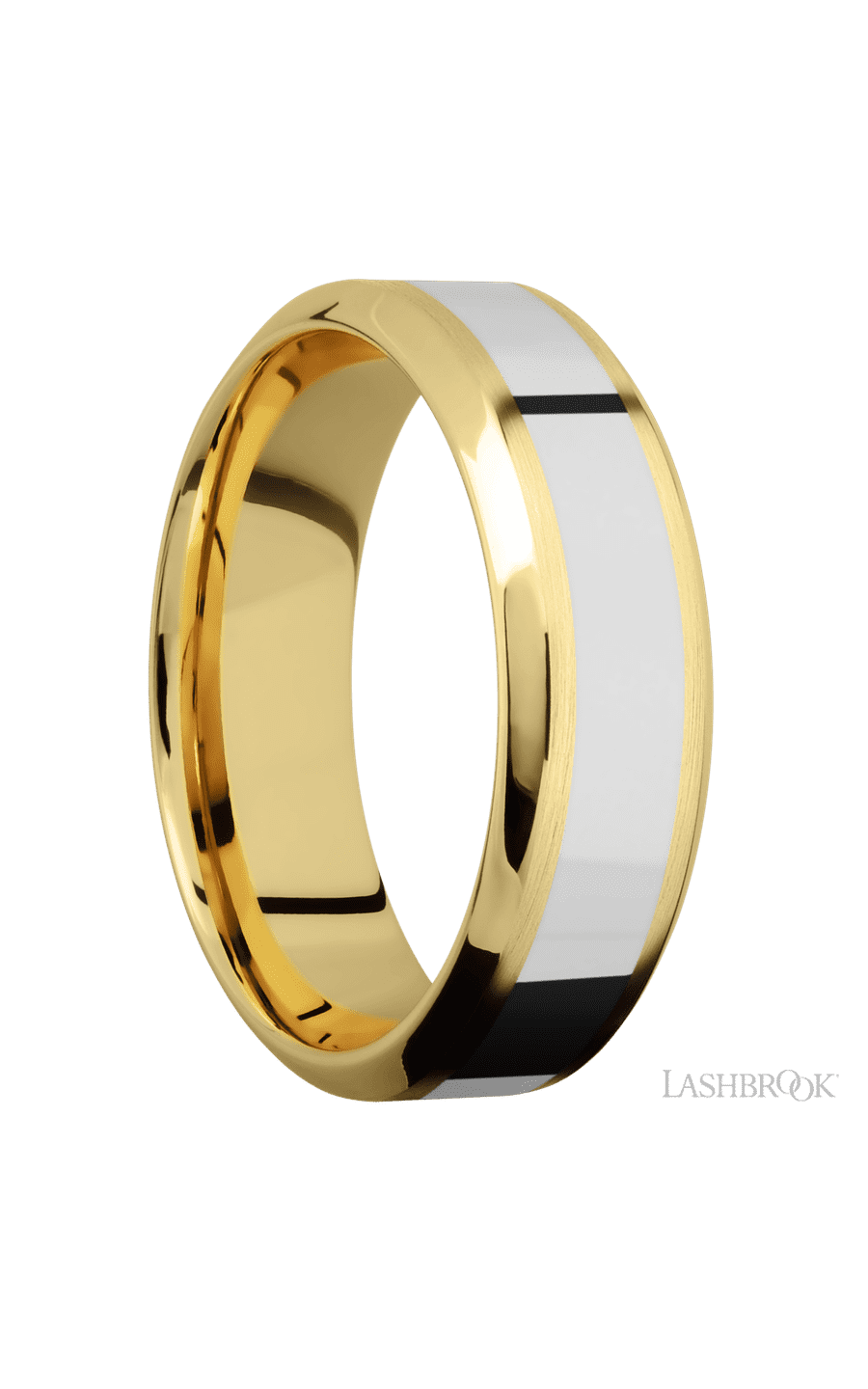7 mm wide/High Bevel/14K Yellow Gold band with one 3 mm Centered inlay of 14K White Gold.