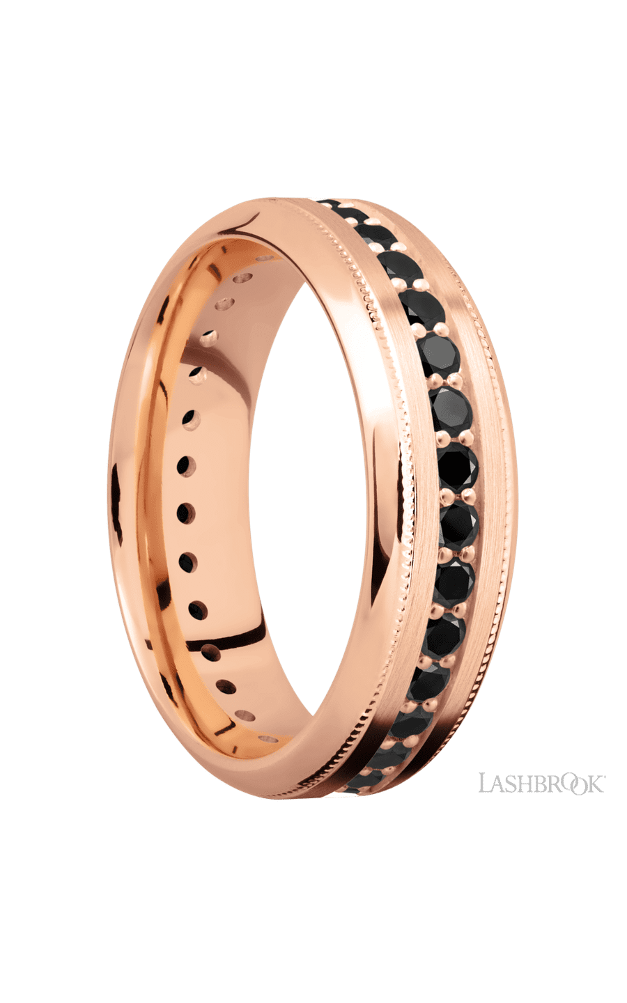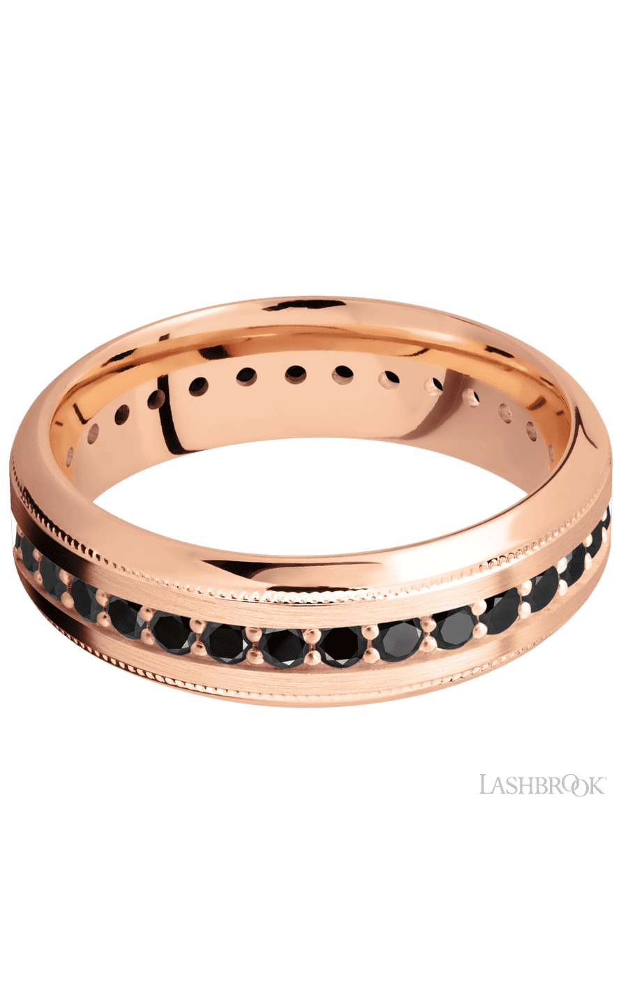 7 mm wide/High Bevel Milgrain/14K Rose Gold band with an Eternity arrangement of .03 carat Round Black Diamond stones in a Bead Channel setting.