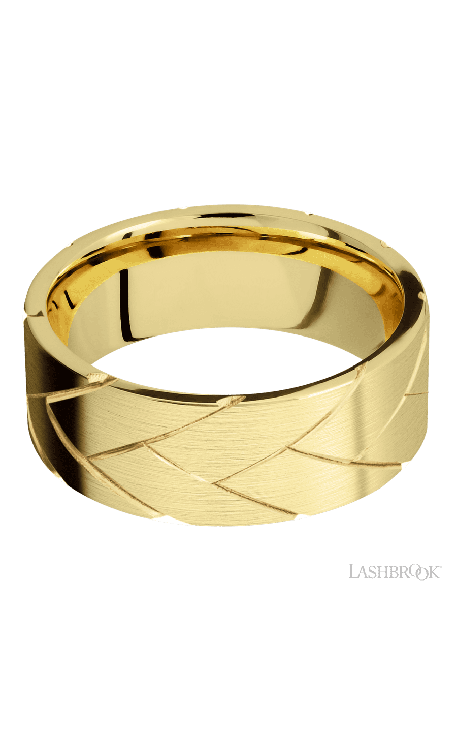 8 mm wide/Flat/14K Yellow Gold band with a machined Flatbraid pattern.