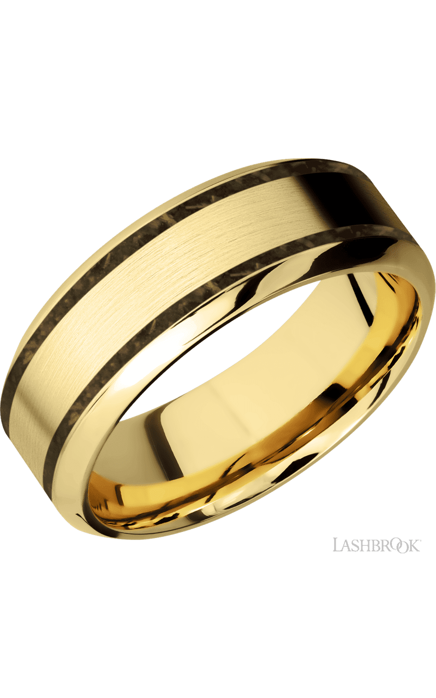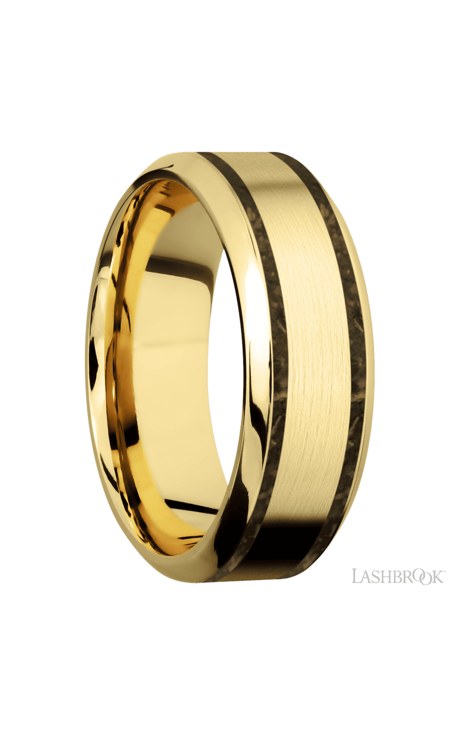 8 mm wide/High Bevel/14K Yellow Gold band with two 1 mm Wide inlays of Gold Tiger Eye.