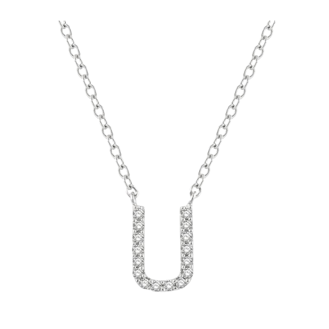 Initial pendants offer a personalized feel. Whether it is wearing one's own initials or the initials of a loved one, the initial pendant is a popular choice. It can be worn by itself or layered with other dainty pendants. So, if you have a 'U' initial in mind, this initial pendant would be a perfect buy. It is also decorated with round-cut diamonds to enhance its appeal. There is a total of 16 prong set round cut diamonds embellishing the initial pendant. A Cat chain carries the pendant, both of which are styled in 14 karat white gold. Total diamond weight is 1/20 ctw.