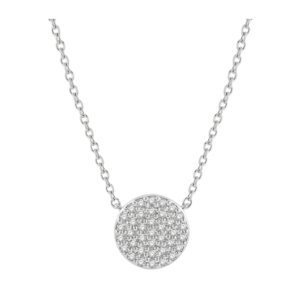 A pretty and stylish disc necklace for your jewelry collection! The necklace makes a good addition to your everyday looks. Although small in size, the solid gold necklace is beautified with round-cut diamonds that fill the entire disc front, giving it an eye-catching look. There is a total of 37 prong set round cut diamonds embellishing the disc necklace. A Cat chain completes the necklace, which is fashioned in a rhodium finish 10 karat white gold. Total diamond weight is 1/6 ctw.