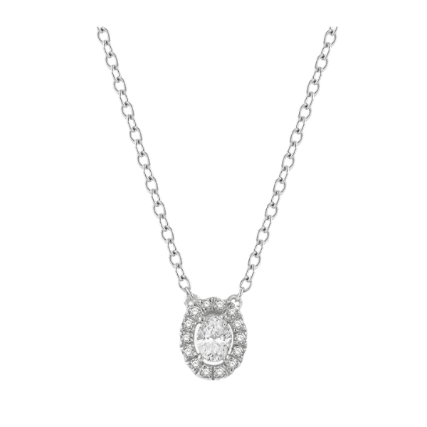 A small, sleek diamond pendant, this makes a nice layering piece with other delicate pendants of its kind. If preferred, it can be worn by itself too. The pendant features an oval shape, with an oval mount in the center and an oval halo around it. Both the mount and the halo are decorated with diamonds. While a 1/6 ctw fancy prong set oval cut diamond adorns the center mount, 14 fish tails set round cut diamonds embellish the halo around it. A Cat chain carries the diamond pendant, both of which are designed in a rhodium finish 14 karat white gold. Total diamond weight is 1/4 ctw.