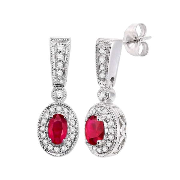Captivate her with the simple elegance of these milgrain finished Ruby and diamond earrings. The earrings feature an alluring oval cut Ruby in prong set, complemented by 42 brilliant accented round cut diamonds elegantly pave and bezel set in luminous 14 karat white gold. Total diamond weight is 1/3 Ctw and oval cut Ruby measures 5x3 MM.
