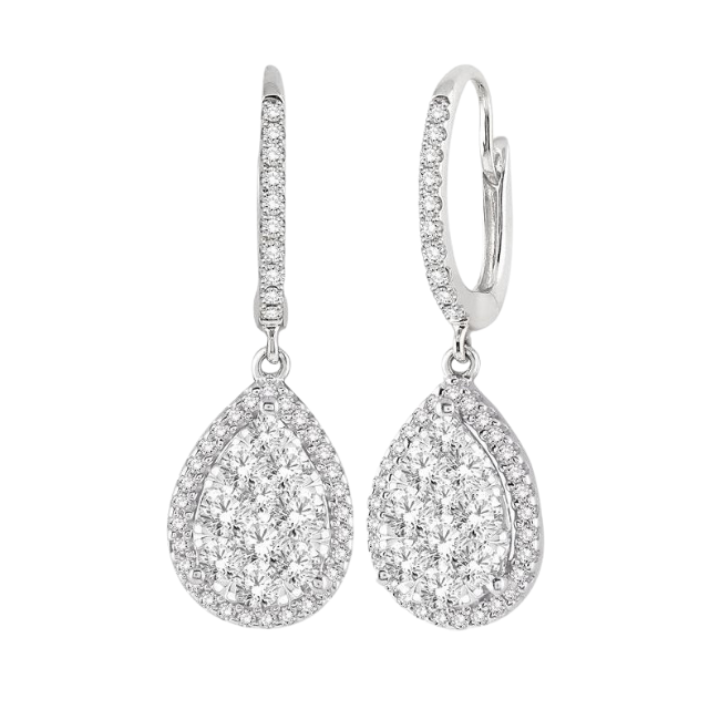 Elegant and simple, these diamond lovebright earrings ensembles with her style. Fashioned in 14 karat white gold, these earrings feature a center array of sparkling round cut diamonds in pear shaped design that are embellished by a frame of smaller round accent diamonds surrounds the center arrays, completing this sparkling design. 100 diamonds are set in invisible and prong setting. Total diamond weight is 1 ctw.