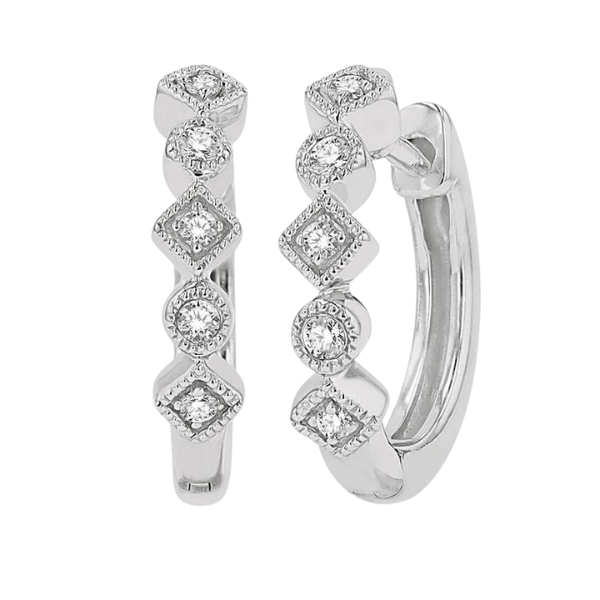 Huggie earrings offer a sensational look, especially when they are stacked. Mix and match your huggie earrings with diamond huggie earrings like this pair here. The earring features a beautiful lattice row of rhombus and circular mounts, linking alternatively to form the earring front. There are 3 each, total 6, rhombus mounts and 2 each circular mounts, total 4 on both earrings. While the circular mounts are embellished with a total of 4 bezel set round cut diamonds, the rhombus mounts are adorned with total 6 prong set round cut diamonds. A milgrain border highlights the mounts. The huggie earring is styled in 14 karat white gold. Total diamond weight is 1/10 ctw.