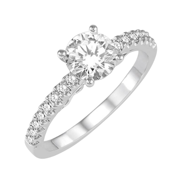 Is there an heirloom stone or any other particular stone that you would like to have reset to create a custom developed engagement ring? Selecting a semi mount ring for the purpose would be your ideal choice. This striking semi mount ring comes preset with 16 unblemished prong set round cut diamonds. These decorate the 14 karat white gold shank, 8 on each side of the center mount. With your choice of center stone in place range from 0.85 carat to 1.20 carat, this semi mount can be transformed into your dream ring. Total diamond weight is 1/4 ctw.