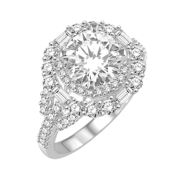Make a statement of your deep love with this romantic diamond semi-mount ring. Fashioned in 14 karat lustrous white gold, this ring is embellished with 62 prong and pave set glittering baguette and round cut diamonds in two beautiful circles on the head and lined the split shank in a brilliant row. This ring is designed to complement your choice of center stone ranging from 1.25 carat to 1.75 carat. Total diamond weight is 1 1/4 ctw.