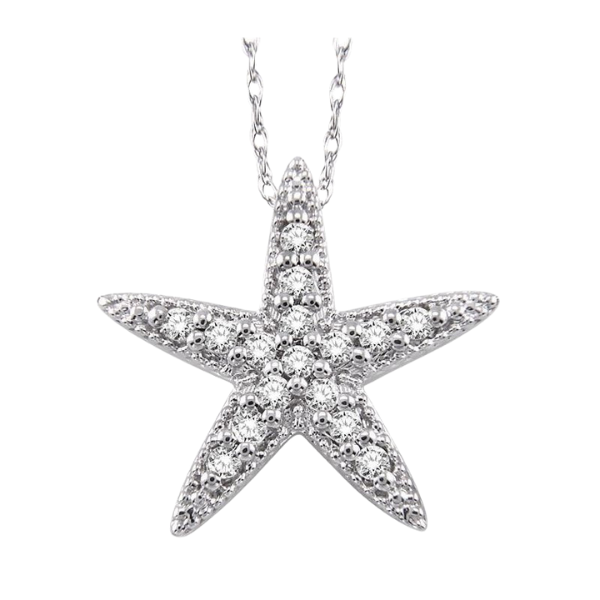 Enthrall her with starbursts of light-reflecting beauty of this mesmerizing Diamond Sea Star Pendant crafted in 14 karat white gold. The center of the star is adorn with 16 prong set shimmering round cut diamonds. This dainty pendant hangs from a rope chain. Total diamond weight is 1/6 ctw.