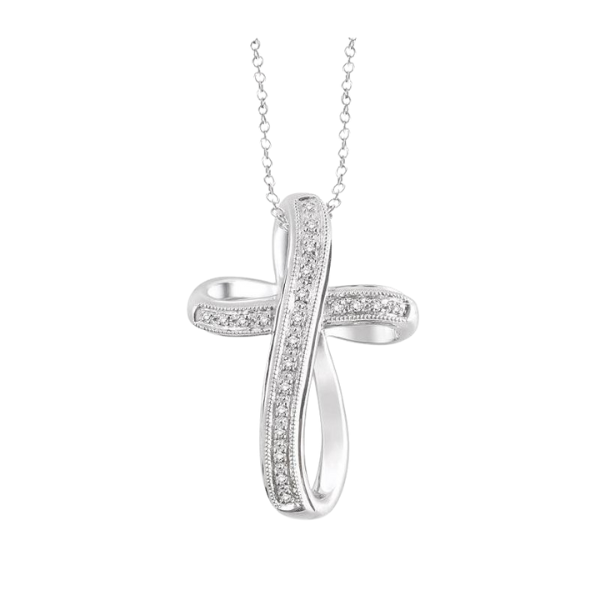 This religious icy cool sterling silver diamond cross pendant is enlightened by the divine light of love and faith. This ravishing cross pendant is embellished with 22 radiant pave set single cut diamonds and hangs up from a beautiful Cable chain. Total diamond weight is 1/10 ctw.
