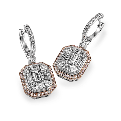 These dramatic, contemporary earrings feature an intricate center diamond mosaic accentuated by even more white and pink diamonds.