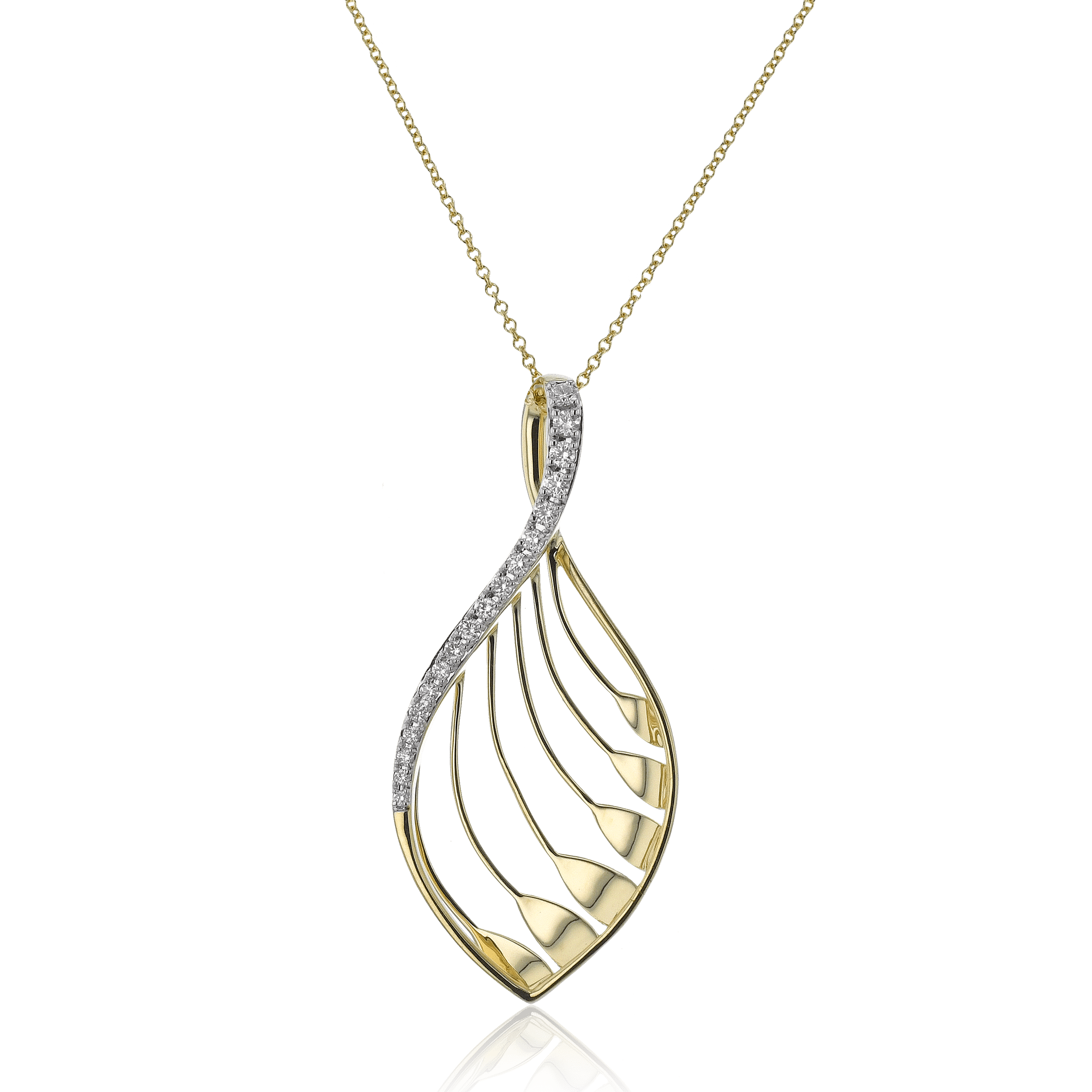 This beautiful pendant features a unique, overlapping design adorned with shimmering white diamonds.