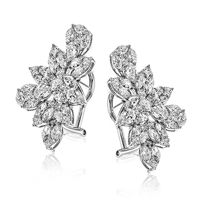 These eye-catching earrings feature a highly intricate design set with a sparkling combination of marquise, princess and pear diamonds.