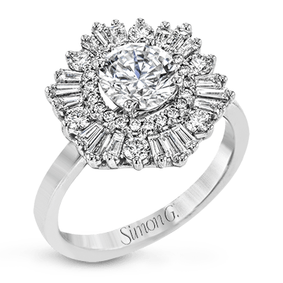 This absolutely stunning ring features a unique halo design set with a dazzling combination of round and baguette diamonds.