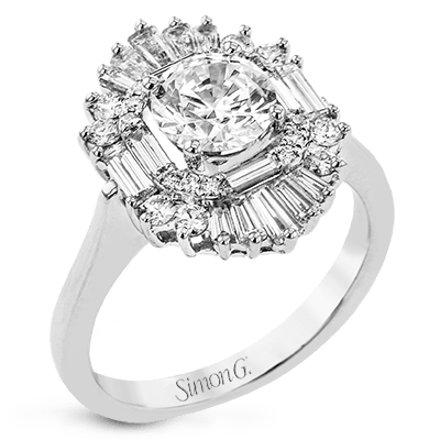This distinctive ring is an ode to Art Deco design and features .23 ctw of round diamonds in its halo along with a burst of .70 ctw of baguette diamonds.
