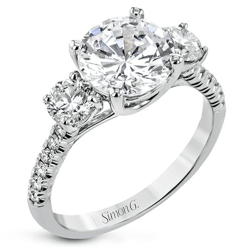 This eye-catching engagement ring features two sparkling side diamonds as well as brilliant diamond accents along the shank.