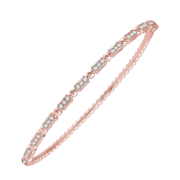 A delicate box link lattice diamond bangle, this makes an elite accessory for semi-casual to formal wear, and a great addition to the wardrobe. It features small box shape links, embellished with round cut diamonds on the top half, while the bottom half displays an attractive thick milgrain pattern. There are 11 box links, each of which is decorated with three pave set round cut diamonds, a total of 33 diamonds on all box links together. The bangle is framed in 14 karat rose gold. Total diamond weight is 1/2 ctw.